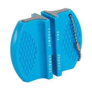 Lightweight, compact sharpener with ceramic and tungsten carbide blades and pre-set angles. Non-slip rubber feet and lanyard hole. For use with all knives. 25mm thick.
