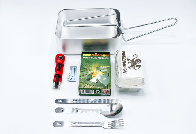 The BCB Outdoor Cooking Set has all the outdoor cooking gear you need, including 2 mess tins with folding handles, a clip set of cutlery, Steridex hand steriliser, a folding cooker, fire flint with a compass in the handle and fire dragon gel fuel. Get set for your next camping trip with this basic complete cook set, which has everything you need for your next wilderness adventure!