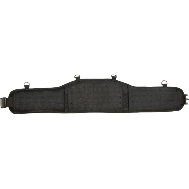 The exterior of the belt features a full lazer MOLLE design, allowing for easy attachment and arrangement of various pouches and accessories. The interior includes a webbing belt for added stability and support during wear. Additionally, the belt boasts 4 D-ring attachment points for further customization and accessory attachment.