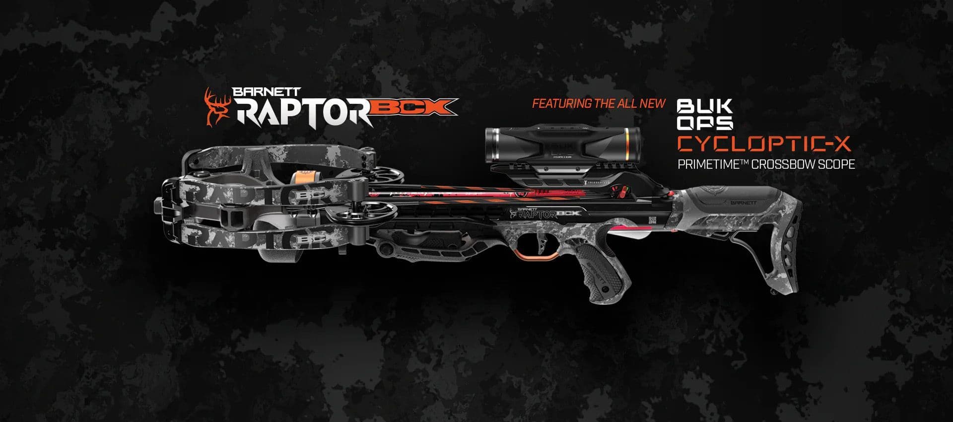 Introducing the Barnett Hyper Raptor BCX The ultimate hunting* crossbow that combines state-of-the-art technology with impressive performance. As the latest addition to the range, this crossbow shoots 20 HyperFlite arrows at a remarkable 425 fps, delivering the kind of kinetic energy you need for powerful penetration.
