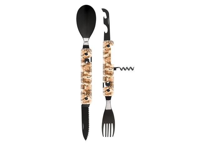 • Includes a large spoon, a 5-pronged fork, a knife with a micro-serrated blade, a 4-spiral corkscrew, a can opener, and a bottle opener