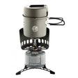 - Kit includes: Crux Lite stove (72g) with handheld piezo ignitor, 0.9L Terra Weekend HE Heat Exchange pot with non-stick coating, fry pan lid, clip-on windshield, stuff bag, and user manual
