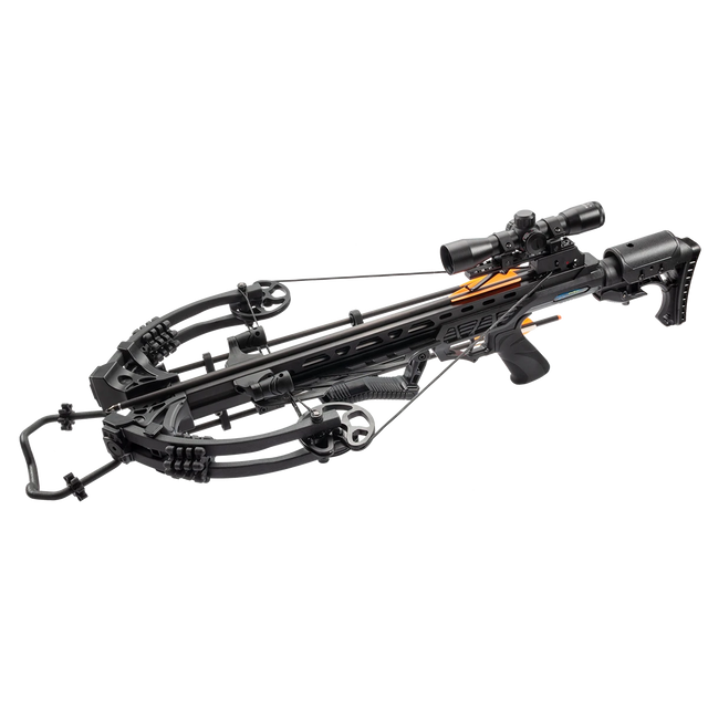 The comprehensive kit accompanying the crossbow includes key accessories such as four carbon bolts, a 4x32 rifle scope, a sling, a quiver, and a cocking string. The side-mounted quiver adds convenience during reloads, ensuring quick access to bolts without disrupting the drawing process.