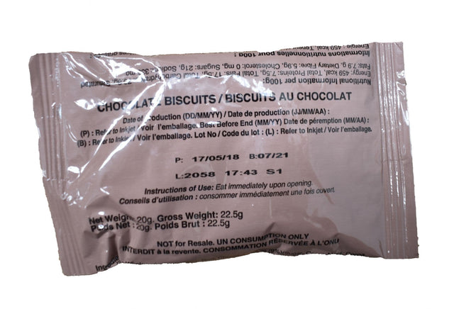 The British Military Ration Pack Meal Pouch - Chocolate Biscuits is a must have quick snack when you need a boost of energy on your camping trip, hike or even when out fishing. Originally made for the British Military these biscuits are great for eating on the go and are very lightweight to make carrying them even easier! Add these chocolate biscuits to your kit as a snack or as a dessert alongside your meal!