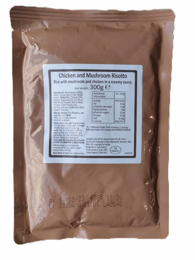 The British Military Ration Main Meal Pouch - Chicken & Mushroom Risotto 300g are great for outdoor use or alternatively stocking up your long term survival supplies! These pouches were originally designed for use within the British military, thus are perfectly nutritionally balanced for survival purposes. You can eat them cold straight from the bag or boil in the bag for a quick and easy meal within minutes!