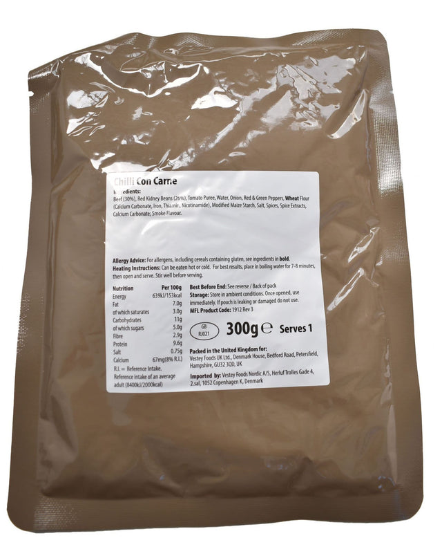 The British Military Ration Main Meal Pouch - Chilli Con Carne 300g are a quick, easy and ready to eat product which is perfect for outdoor use. These pouches were originally designed for the British military, meaning they are perfectly nutritionally balanced for survival purposes. You can eat them cold straight from the bag or alternatively boil in the bag for a quick and easy meal within minutes!
