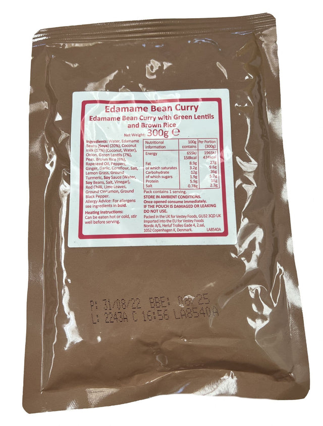 The British Military Ration Main Meal Pouch - Edamame Bean Curry 300g is a delicious vegetarian option which includes green lentils and brown rice. Originally issued to the military, these ration meal pouches are perfectly nutritionally balanced and are specifically designed for survival purposes, making them ideal for outdoor expeditions. They can be eaten cold straight from the pouch or boiled in the bag for a warm meal within a matter or minutes. Great for filling a hole after a long day of adventures!