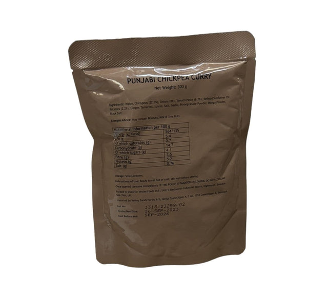 The British Military Ration Main Meal Pouch - Punjabi Chickpea Curry 300g are great for outdoor use or alternatively stocking up your long term survival supplies! These pouches were originally designed for use within the British military, thus are perfectly nutritionally balanced for survival purposes. You can eat them cold straight from the bag or boil in the bag for a quick and easy meal within minutes!