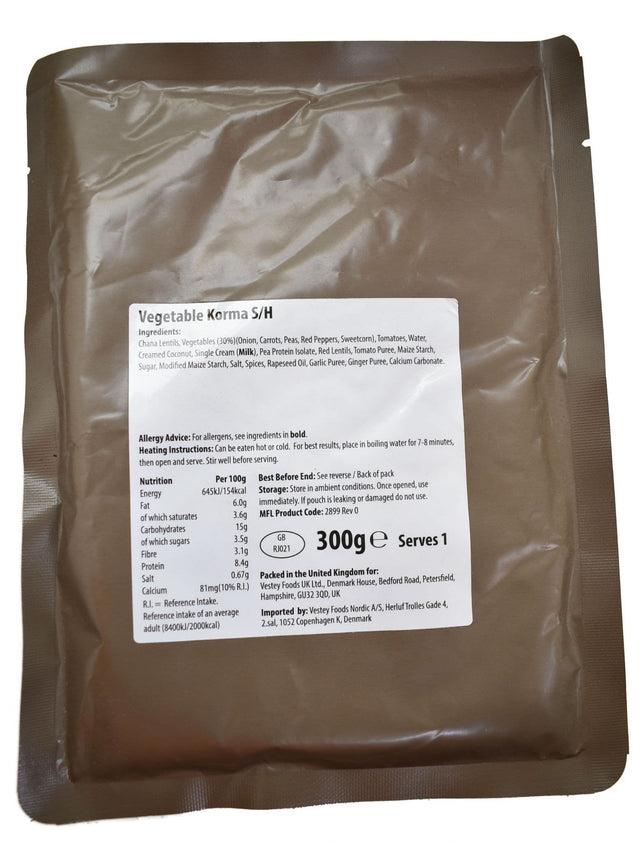 Perfect to pair with long grain white rice, the British Military Ration Main Meal Pouch - Vegetable Korma 300g is a must have when heading outdoors. Whether you are camping, hiking or taking part in your DofE award, these main meal pouches are perfectly nutritionally balanced and are specifically designed for survival purposes. They can be eaten cold straight from the bag or boiled in the pouch for a warm, tasty meal within minutes.