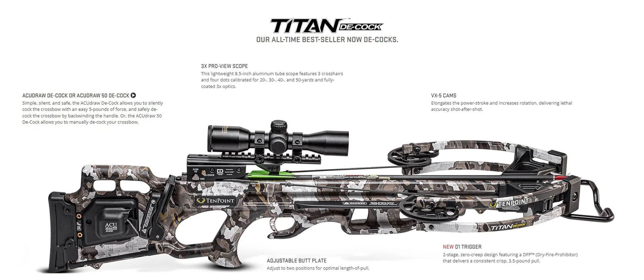 Upgrade your hunting* game with the best-selling TenPoint Titan De-Cock crossbow, now featuring the innovative ACUdraw 50 Rope Sled De-Cock and the precision D1 Trigger.